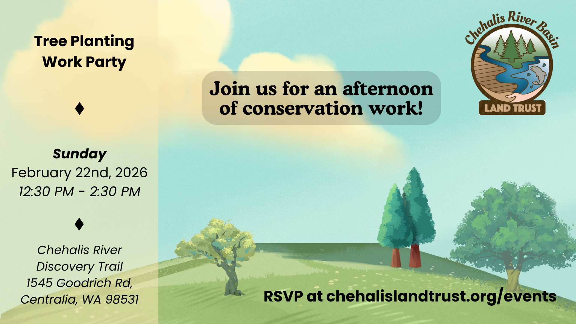 Please join our February 22nd Work party at Chehalis River Discovery Trail to prepare the planting sites for the 2026 tree group and place trees in their new homes along the riverfront.